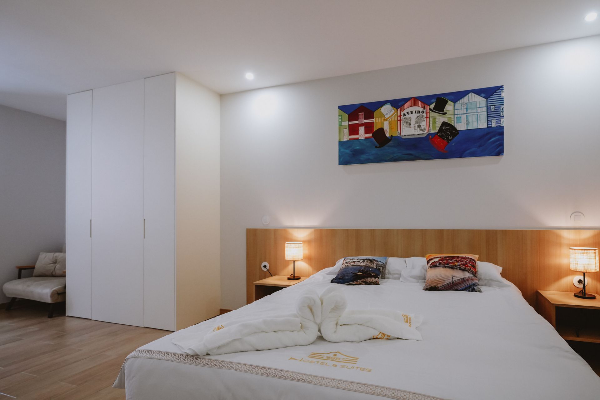 A "Suite 201" tem cama de casal e sofá-cama, enquanto a "Suite 203" e a "Suite 303" incluem cozinha e varanda.